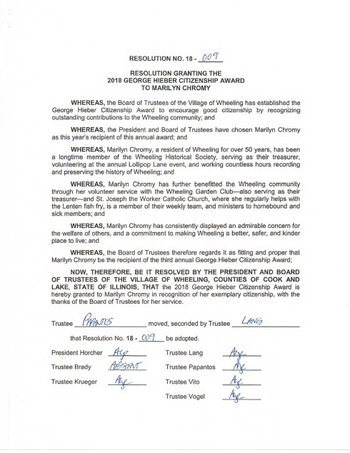 Description Village Ordinance For Marilyn Chromy as Wheeling Volunteer Of The Year