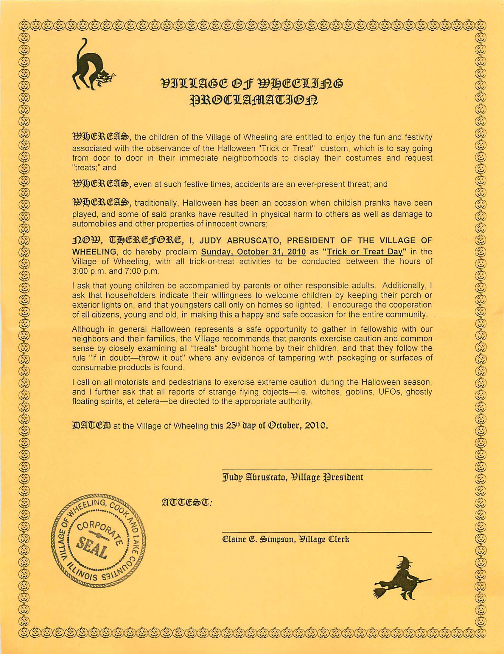 The children of the Village of Wheeling are entitled to enjoy the fun and festivity associated with the observance of the Halloween "Trick or Treat" custom, which is to say going from door to door in their immediate neighborhoods to display their costumes and request "treats;" and even at such festive times, accidents are an ever-present threat; and traditionally, Halloween has been an occasion when childish pranks have been played, and some of said pranks have resulted in physical harm to others as well as damage to automobiles and other properties of innocent owners; |