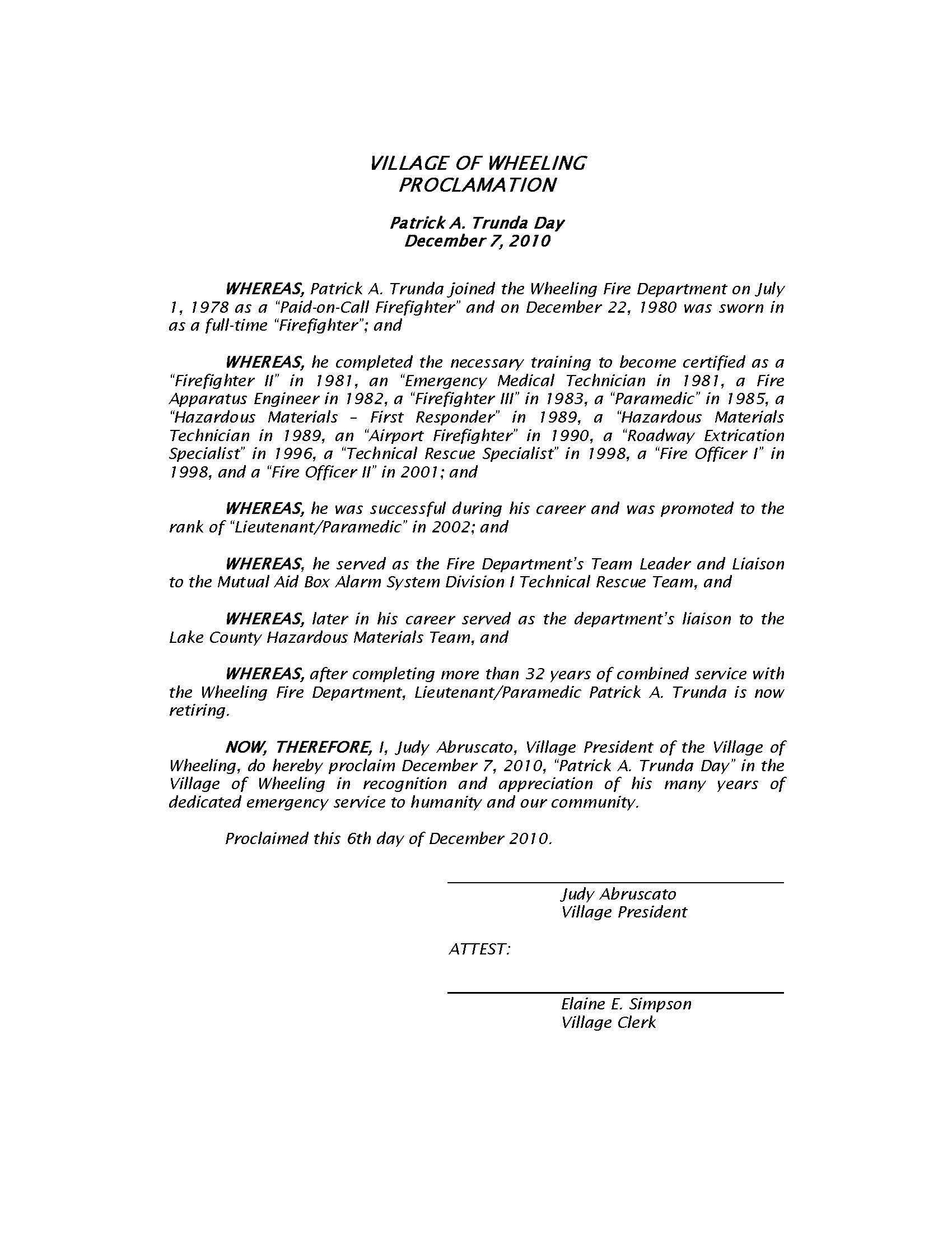 Patrick A. Trunda joined the Wheeling Fire Department on July 1, 1978 as a “Paid-on-Call Firefighter” and on December 22, 1980 was sworn in as a full-time “Firefighter”; and after completing more than 32 years of combined service with the Wheeling Fire Department, Lieutenant/Paramedic Patrick A. Trunda is now retiring. |