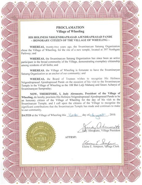 In honor of his visit to the Village of Wheeling and the Swamiaryan Temple. |